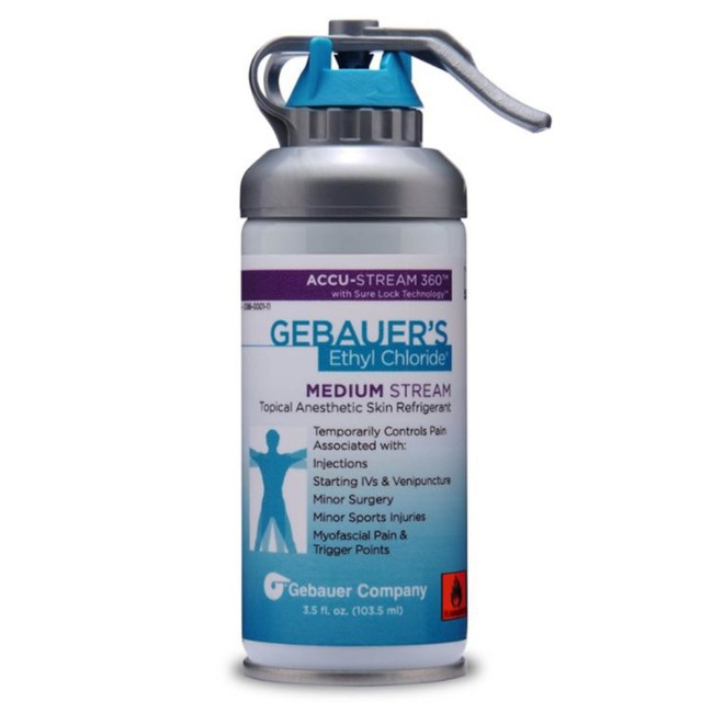 The container holds 103.5 mL of 100% ethyl chloride, packaged for professional use. The canister is compatible with standard procedural workflows and provides a convenient, ready-to-use format for clinicians. Its medium-stream delivery ensures effective and localized skin anesthesia without excessive cooling beyond the targeted area.
