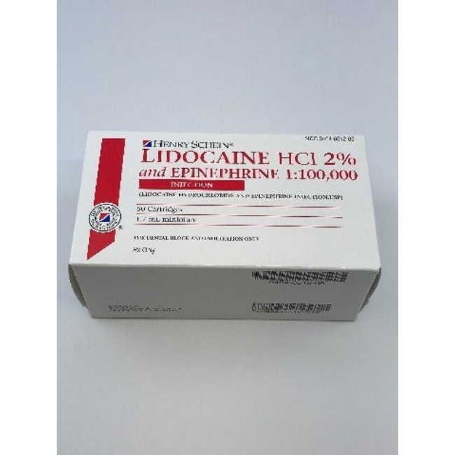 Lidocaine 2% and Epinephrine Injection, 100,000 Cartridge, 50 x 1.7 mL is manufactured by Henry Schein.